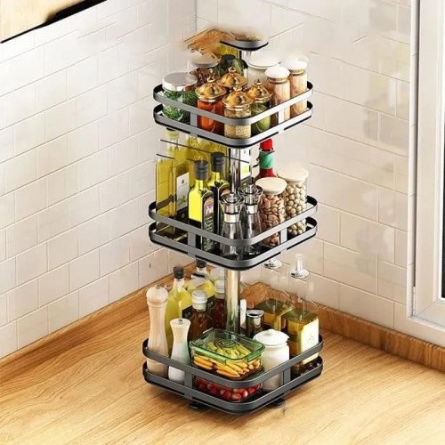 360° Rotating Square Metal Kitchen Organizer Multi-Purpose Storage Rack 3 Tier